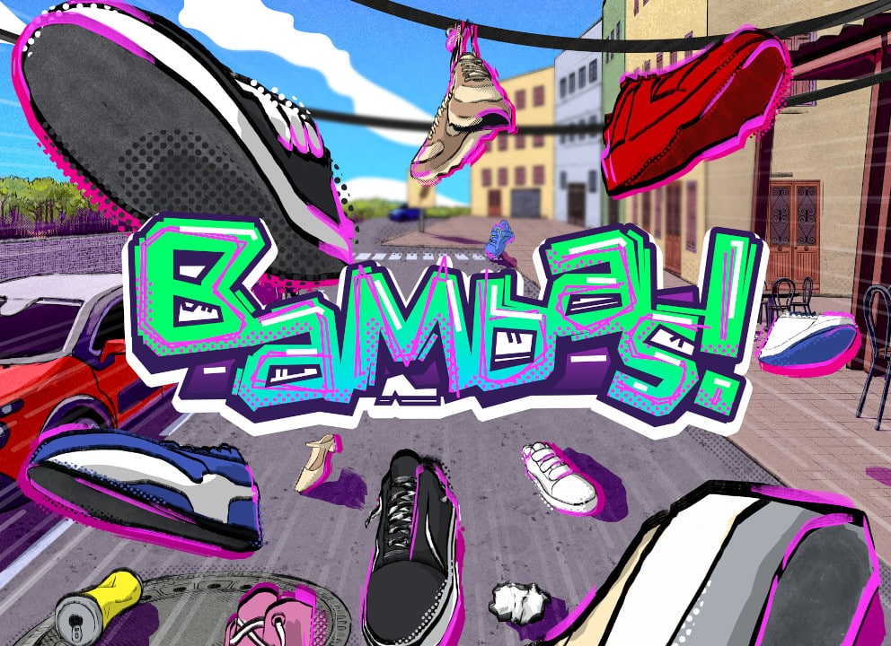 A pesar de que en Bambas! las personas que nos rodean son solo representadas por un par de zapatillas, esta prenda de vestir basta para mostrarnos una parte principal de su personalidad, hasta tal punto de poder imaginarnos, por extensión, el resto del cuerpo. Así, enlazamos su apariencia con aquello que nos pueden pedir, como explotar globos, montar en monopatín o despegar chicles del suelo. Pero la libertad de la que hablábamos antes también significa elegir en todo momento qué hacer y dónde pisar, pudiendo, incluso, saltar sobre charcos, divertirnos en un parque infantil o cruzar un paso de cebra pisando exclusivamente las líneas blancas.